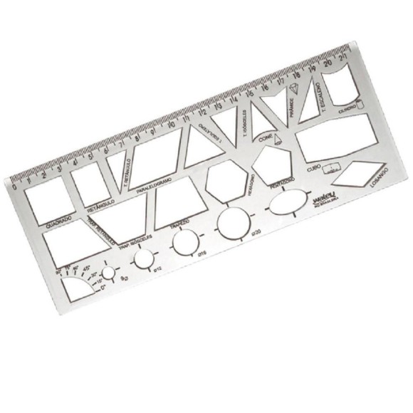 A Régua Geométrica é ideal para trabalhos escolares e uso técnico, possuindo diversas formas geométricas vazadas.