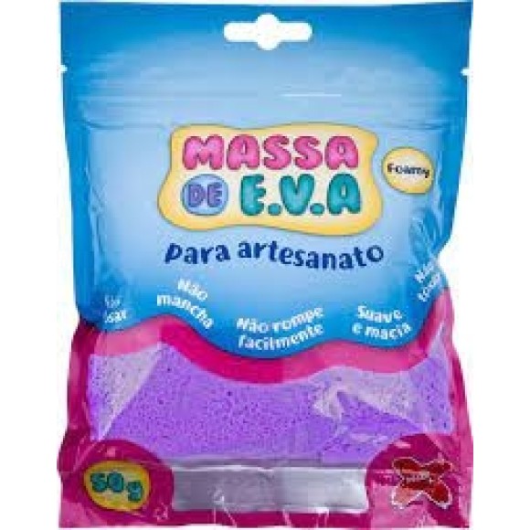 Massa flocada de eva para uso em artesanatos. Com flocos de isopor, secagem em aproximadamente 6 horas em contato com ar, não tóxico, tingível, suave e macia e não mancha. Produto muito leve após seco, super maleável, rendimento equivalente a 50g de biscuit.